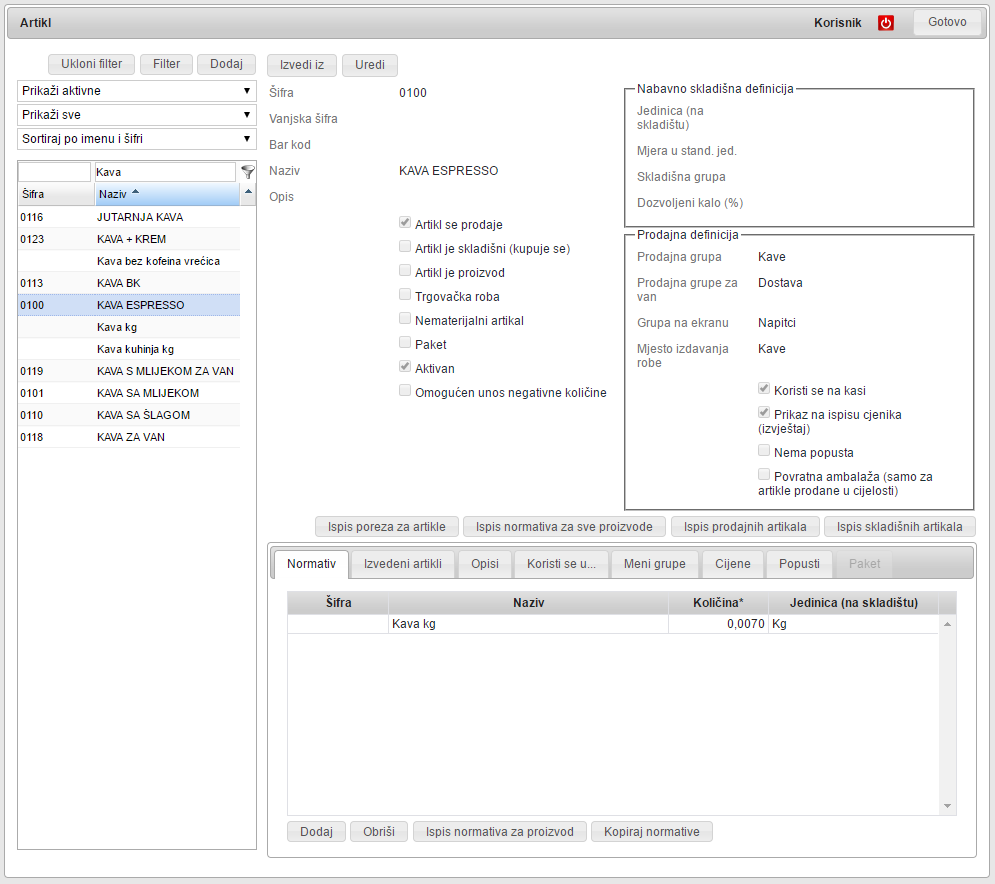- Normativi – tablica u kojoj, za prodajne artikle, definiramo što će se rasknjižiti