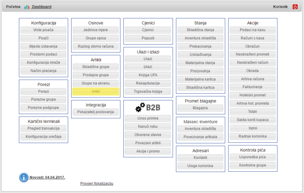 - Cijene – pregled svih cijena nekog artikla; po režimima, lokalima, aktivni, neaktivni. Tu čak možete i promijeniti cijenu.