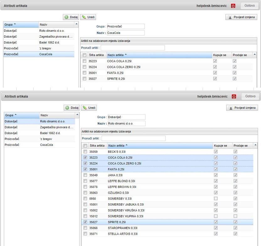 - u atribut CocaCola (grupa Proizvođač) smo dodali sve artikle koje proizvodi Coca Cola (Cola, Fanta, Sprite), a u atribut Roto dinamic d.o.o. (grupa Dobavljač) dodamo sve artikle koje smo naručili (dobavili) od Roto dinamic-a.