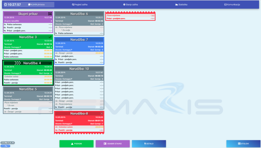 - NARUDŽBE (Na sredini ekrana) – Skupni prikaz, Završene narudžbe, Narudžbe u pripremi, Obrisane narudžbe