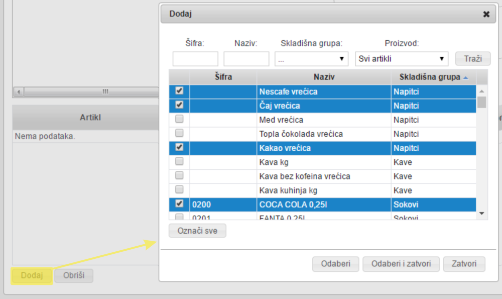 Kada ste unijeli zaglavlje unesite stavke. Odabirom gumba Dodaj koji se nalazi ispod polja za unos stavki otvara vam se preglednik artikla po kojem pretražujete po nazivu, označavate kvačicom i s Odaberi ili Odaberi i zatvori stavljate u svoj dokument izlaza. (isto kao kod ulaza)