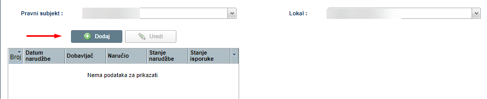Odabiremo pravni subjekt i lokal, te pritisnemo „DODAJ”