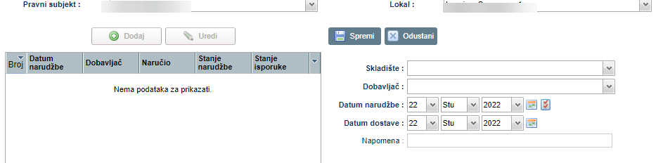 Prikazat će se forma sa unosom skladišta, dobavljača, datume i napomene: