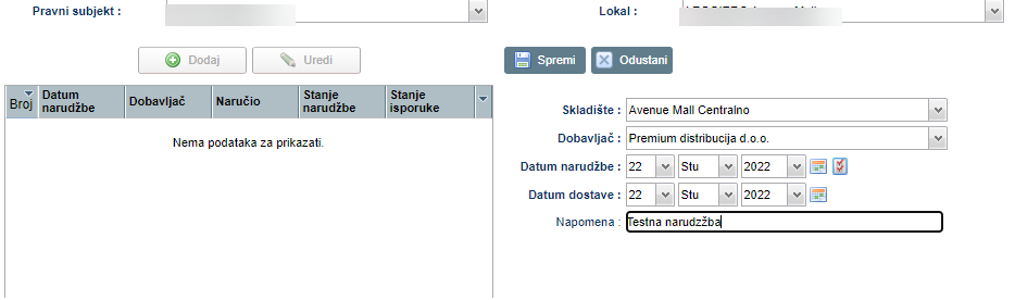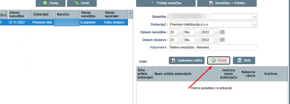 Nakon što spremimo, otvara se polje za dodavanje stavaka narudžbi: