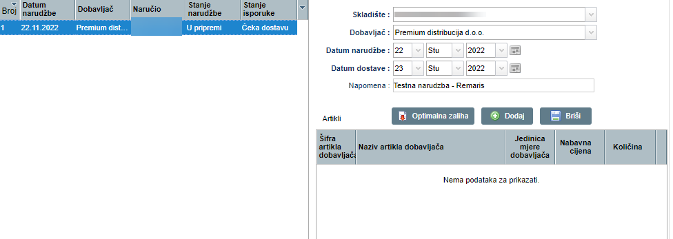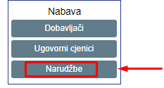 Kada smo unjeli dobavljače i ugovorene cijene, prebacujemo se na modul „NARUDŽBE”