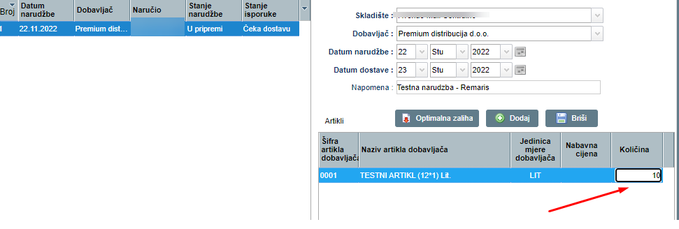 U polje KOLIČINA, upisujemo količinu koju želimo naručiti te pritisnemo ENTER: