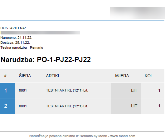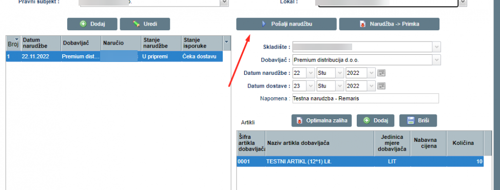 Nakon što smo dodali sve stavke, pritisnemo „POŠALJI NARUDŽBU”. Narudžba će se poslati na mail dobavljaču koji je unešen pod modulom „DOBAVLJAČI