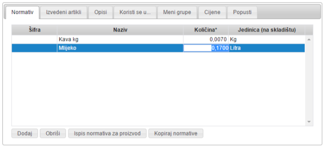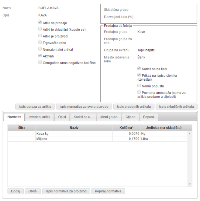Normative možemo dodati u artikle koji su označeni kao Prodajni artikli. U tom slučaju lijevo ispod normativne liste se pojavi gumb Dodaj.