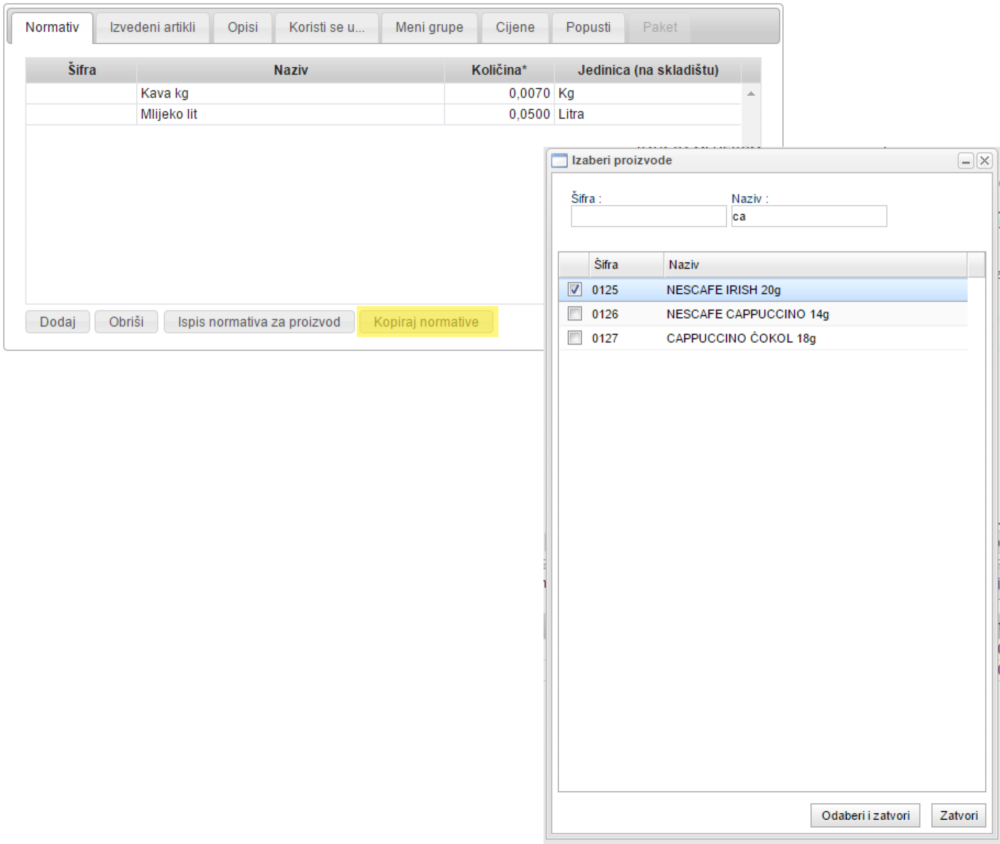 - Dodaj i zatvori – dodaje artikle u normativnu listu i zatvara pretraživač artikala